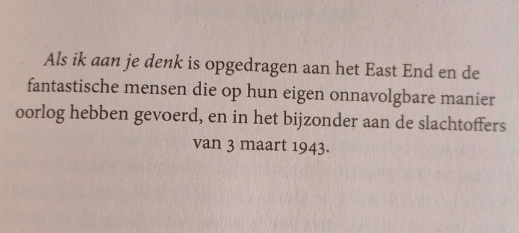 Wanneer je al eerder een boek uit deze serie gelezen hebt herken je meteen weer de prettige, eenvoudige schrijfstijl van Ellie Dean. Ze weeft moeiteloos historische feiten door haar fictie. Zo schrijft ze meerdere keren over gebeurtenissen zoals de ramp in Bethnal Green. Ze weet feilloos de dagelijkse realiteit van oorlog, met zijn bombardementen, rantsoenen, en angst te beschrijven. Deze achtergrond creëert, niet alleen in het tiende deel ‘Als ik aan je denk’, maar door de gehele serie, een geloofwaardige, tastbare sfeer. Zonder dat het een opsomming wordt van een saaie geschiedschrijving.