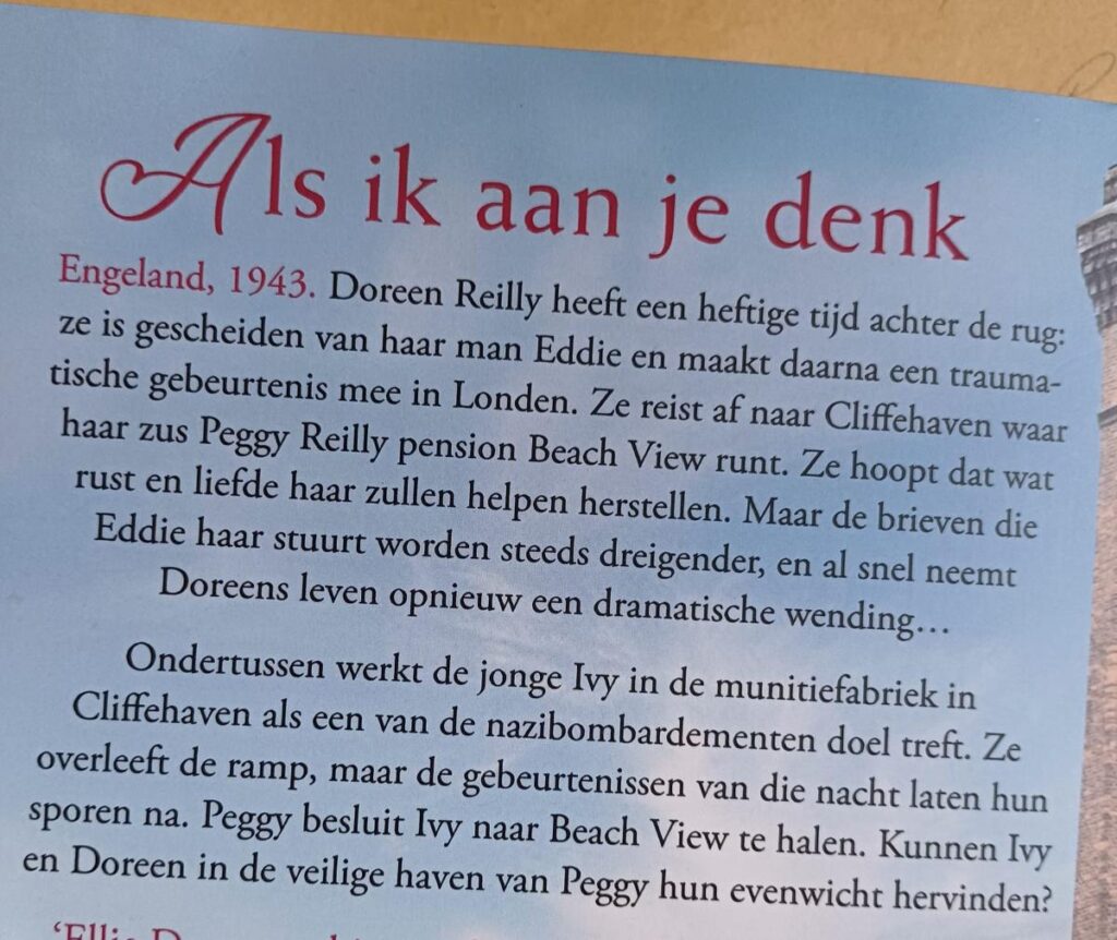 Pension Beach View in Cliffeaven blijft een veilige thuishaven. Voor zowel de personages als de lezers. Het leert ons dat zelfs in oorlogstijd, of andere donkere persoonlijke periodes, warmte, liefde, verbondenheid maar ook zelfspot en humor het fundament is van herstel maar zeker van ons bestaan. Ik kijk na het lezen van ‘Als ik aan je denk’ nu alweer uit naar het volgende deel.