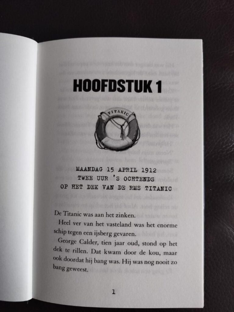 Het enige minpuntje dat ik kon ontdekken, is de leeftijdsindicatie. Want ‘De ondergang van de Titanic’ wordt aangeraden voor 10+. Gezien het enkelvoudige plot en de korte zinnen met groot lettertype, denk ik dat het al voor jongere kinderen zeker geschikt zal zijn. Het is een interessant onderwerp en het is als een spannend avontuur geschreven. Kinderen zullen zeker meegesleept worden in de vaart van het verhaal. Door het grotere lettertype is het denk ik ook geschikt voor kinderen die wat meer moeite met lezen hebben of het minder leuk vinden. Je vliegt door de bladzijdes.
