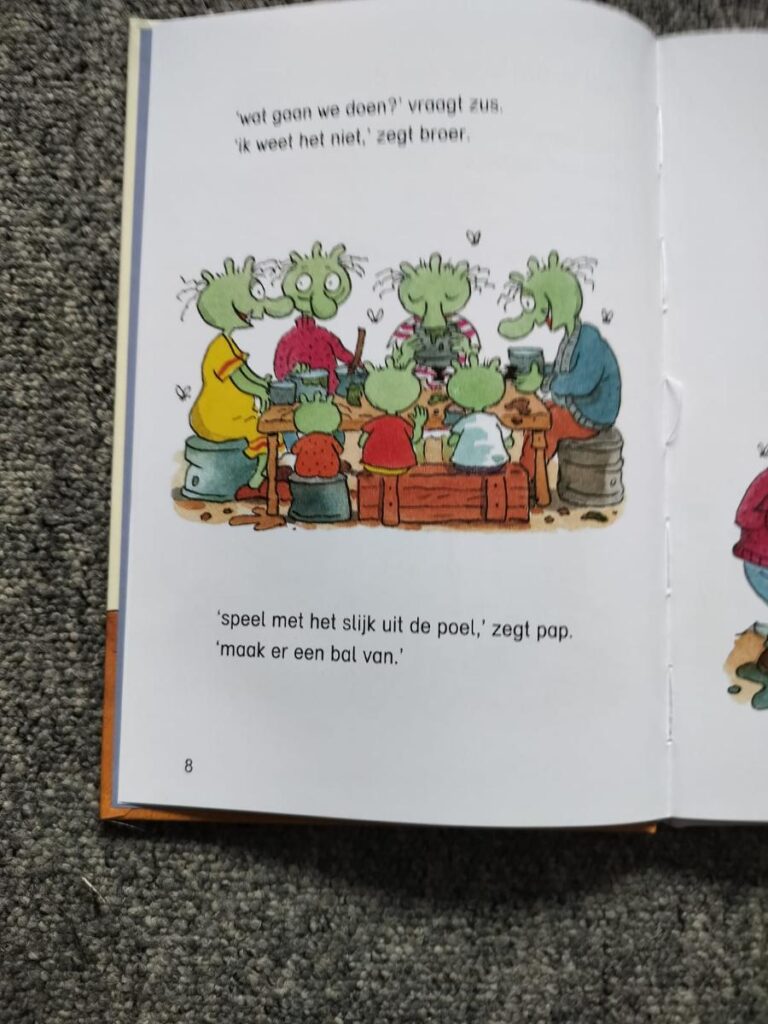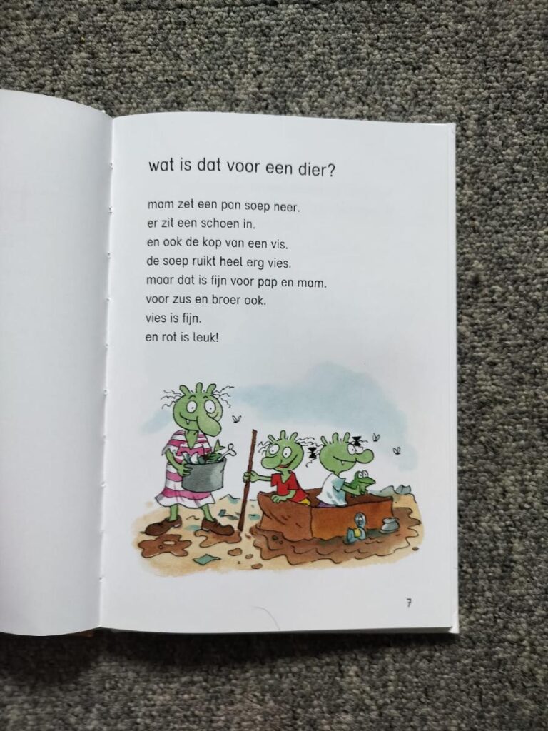 De Smoezels zijn lekker vies. De woorden die ze gebruiken zijn gekke vreemde woorden die vaak ook vies zijn. Kinderen vinden dit heel erg leuk. Deze gekke vieze woorden zitten helaas iets minder in dit AVI boekje omdat dit te lastig is qua technisch lezen. De woordjes in De Smoezels en de vieze hond zijn eenlettergrepige woorden. Toch past het goed bij de sfeer en de prentenboeken. Ik vind het knap dat er met alleen eenlettergrepige woorden toch zo’n leuk verhaal op papier is gezet.