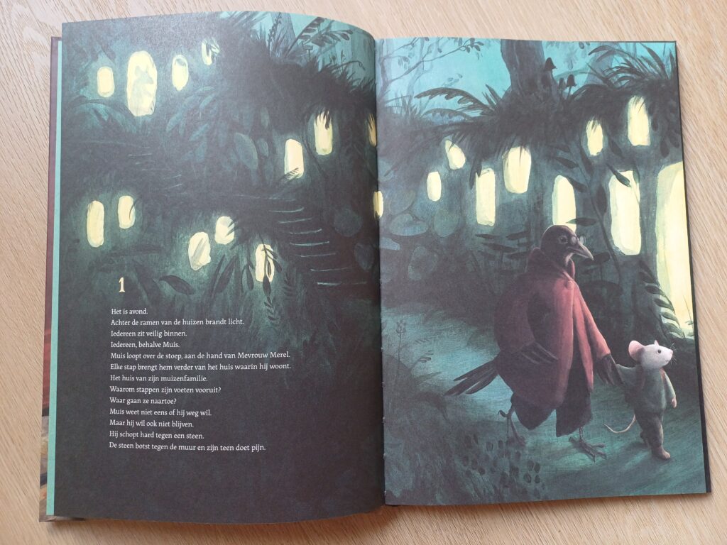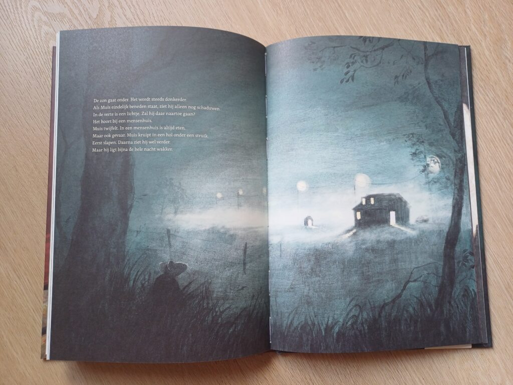 Het verhaal van Een thuis voor muis is niet alleen maar leuk, ondanks dat het goed afloopt. Muis moet eerst wel opzoek naar een nieuw thuis. Op avontuur. De illustraties zijn prachtig. Donker, als je vaker recensies van mij hebt gelezen weet je wellicht dat ik meer ben van de lichte illustraties. Maar dit is heel passend bij het verhaal. Het maakt het ook intiem. Alsof je een kijkje krijgt in het leven van iemand anders, van muis. Zijn avonturen, belevenissen en zoektocht. Ja, de illustraties zijn mooi en passend bij het verhaal. Aandoenlijk soms ook.