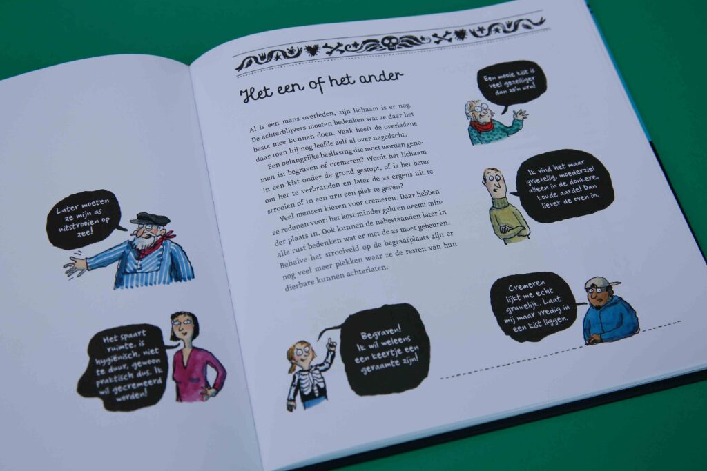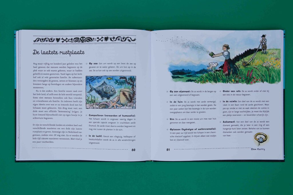 Persoonlijk trok de voorkant van Een tuintje op je buik al meteen mijn aandacht. Zoals de ondertitel al zegt; over de dood en alles eromheen. We weten allemaal dat mensen, en dieren, een keer doodgaan. We hebben het al eens meegemaakt van dichtbij of van horen zeggen. En toch blijft het iets ongrijpbaars. Er is zoveel dat we niet precies weten. Zelf vind ik het ook interessant hoe verschillende culturen, landen en geloven hier mee omgaan. Ook daarover lees je in dit boek. Ook vind ik het belangrijk dat kinderen enige weet hebben van de dood. Dat je daar als ouder dus samen over praat, vragen beantwoord of ze opzoekt. Er zijn bijvoorbeeld genoeg kinderen die een tijd niet durven te slapen als ze horen dat iemand in z’n slaap is overleden. Dat hoeft niet nodig te zijn als je hier eerder al eens over hebt gesproken.