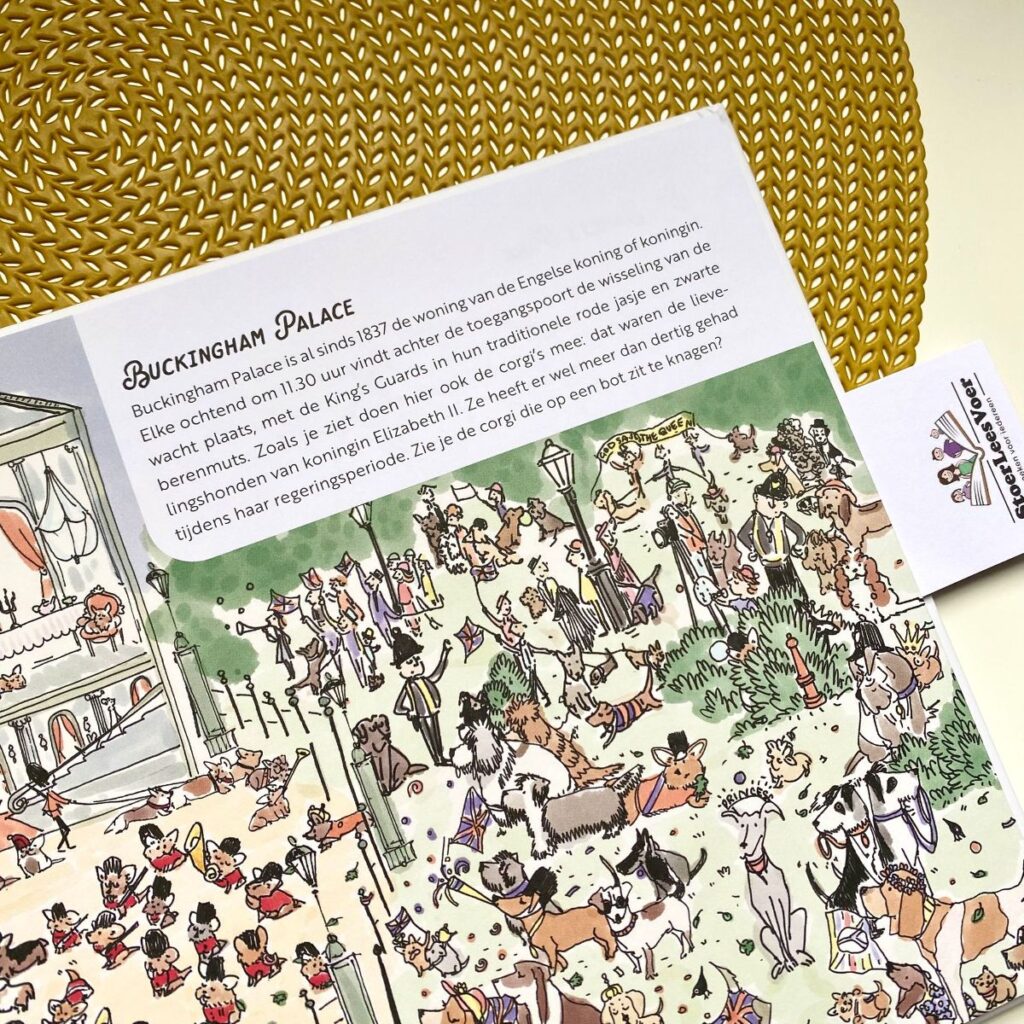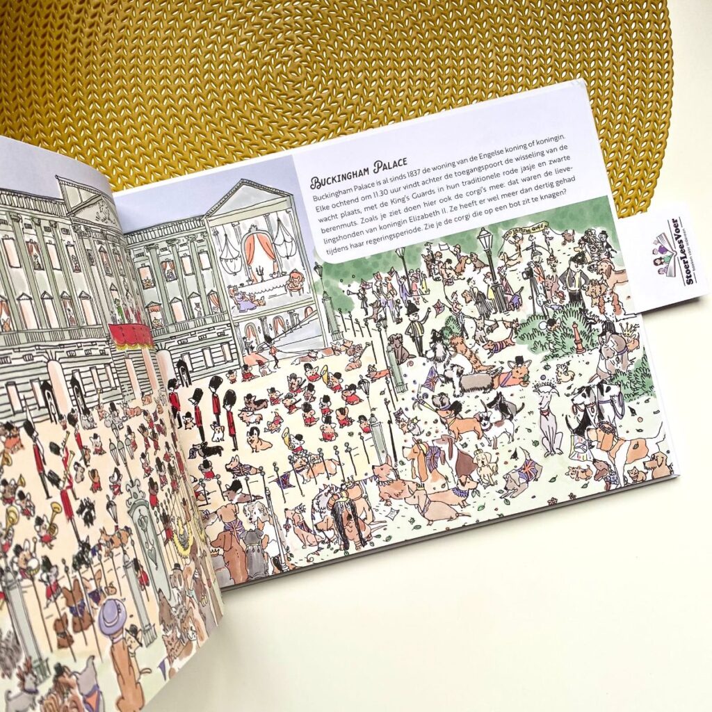 Mijn oudste dochter schrok meteen wat door het eerste woord ‘Buckingham Palace’. Lang en Engels, meteen was haar leeszin door onzekerheid weg. En toen we de zoekopdracht gingen lezen, zoek de corgi, hadden we geen idee wat een corgi is. Vanaf dat punt zijn mijn dochters gewoon in de leuke prenten gedoken en haalden daar hun eigen verhaal uit. Soms wilden ze weten waar in Londen het was en daar kon ik mee helpen.