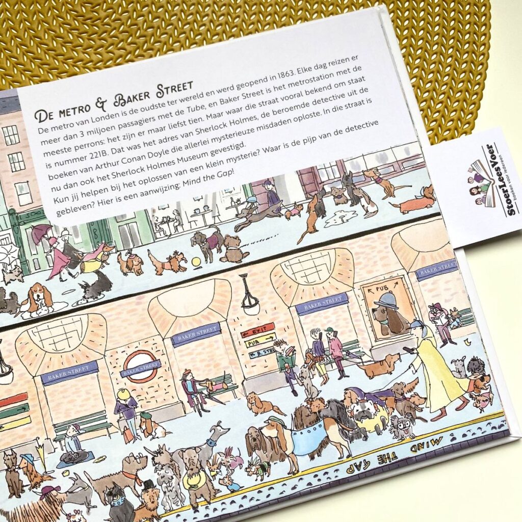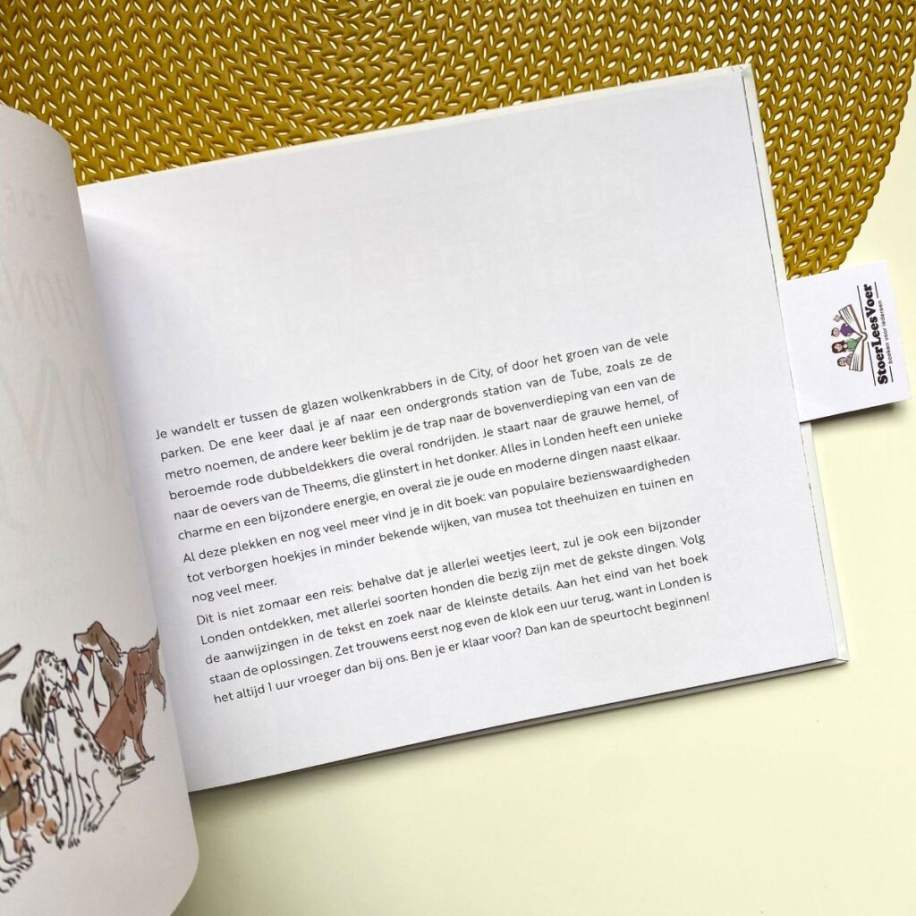 Wij zijn echt wel heel erg gecharmeerd van de combinatie Honden in Londen. De illustraties zijn leuk en vrolijk en er is heel veel te zien. De locaties zijn redelijk trouw en ademen echt de Londense sfeer. Helaas komt er wel een maar… Het boek wordt aanbevolen voor kinderen vanaf 4 jaar. En dat is zeker passend. Maar een kind van 4 kan niet lezen en de zoekopdrachten staan verstopt in een stukje tekst. Dus ze kunnen niet zelf aan de slag. Dan kan je gaan voorlezen maar ook daar zit een kinkje want de teksten zijn best wel lastig. Voor jonge kinderen dan. Er worden veel Engelse termen gebruikt en ook hondenrassen die voor ons niet per se gangbaar zijn. En als kinderen dan wel zelf kunnen lezen kan dat ook best lastig zijn.