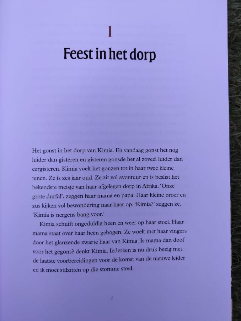 Kimia is een verhaal over een meisje van 6 jaar die leeft in Congo van vroeger. In het verhaal volg je Kimia in haar leven. Daaraan wordt de geschiedenis gekoppeld. Er is steeds een stukje verhalend gevolgd door een stuk informatief om de gebeurtenissen in context te plaatsen. Dit maakt het boek heel sterk en rijk. Het verhaal is denk ik heel herkenbaar voor kinderen. Je kunt je echt verplaatsen in de angst van haar als de Belgen komen. De context is rijk en informatief. Ik wist hier nog weinig van en dankzij deze informatie weet ik nu meer en kan ik het verhaal ook beter plaatsen.