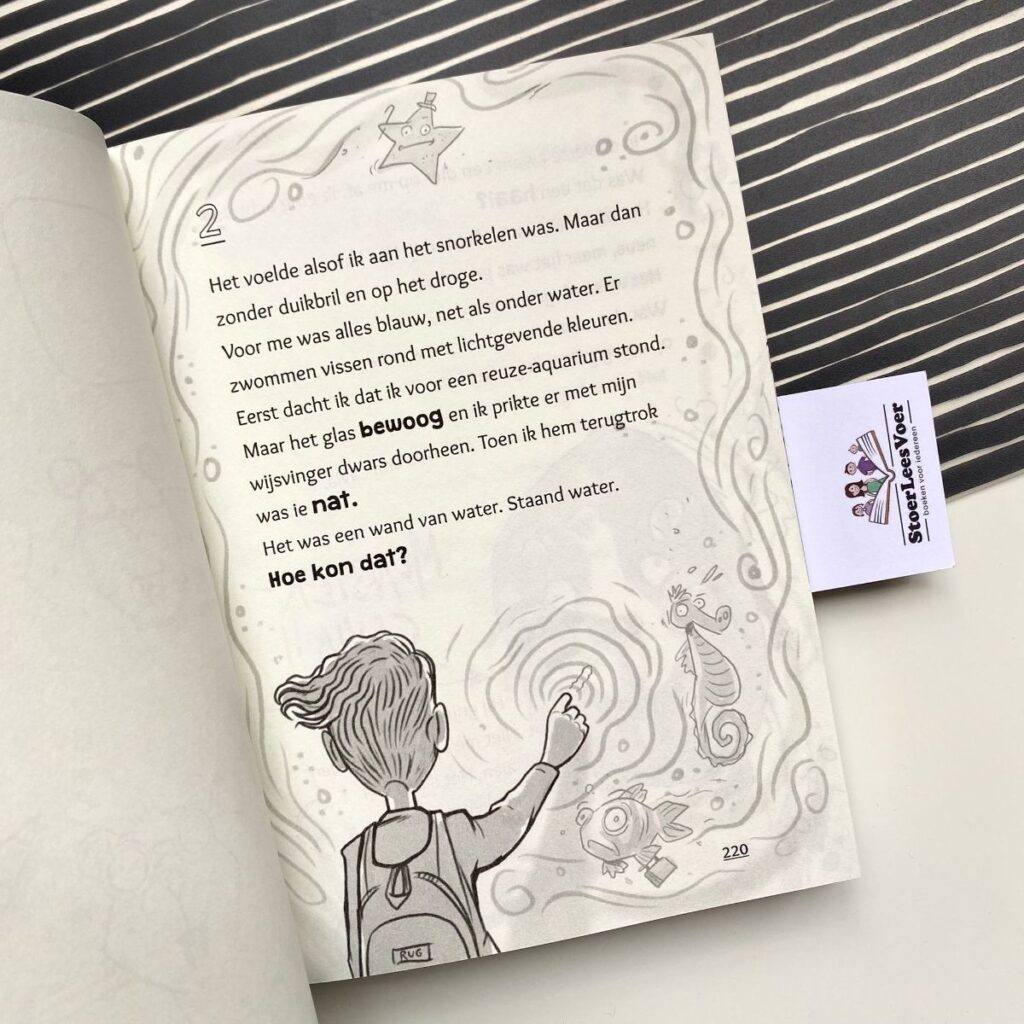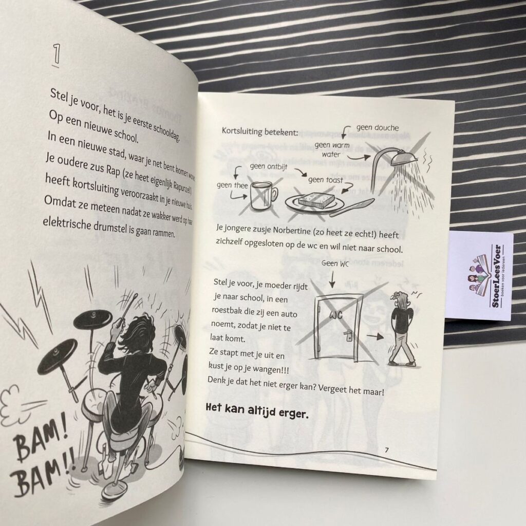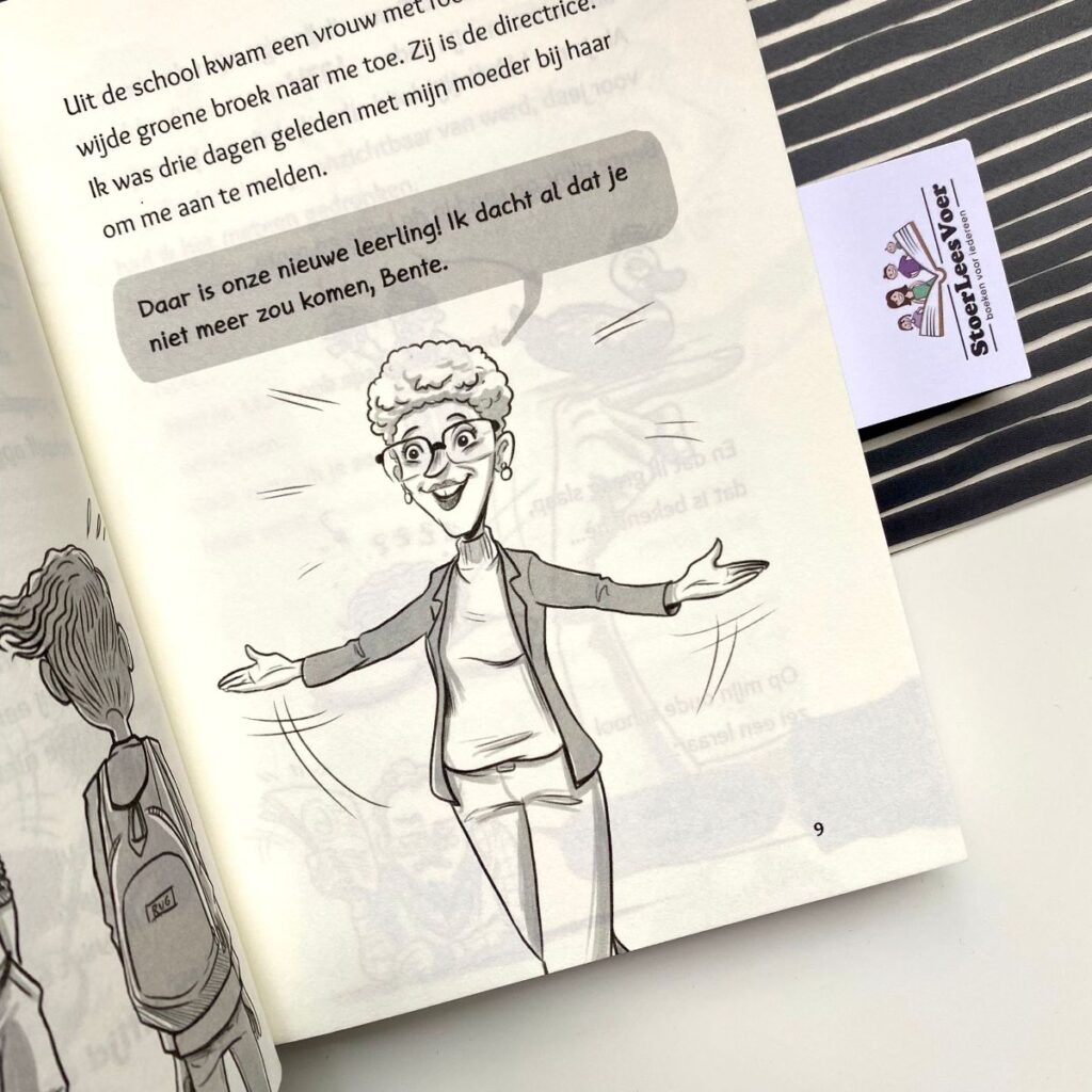 Zonder kloppen kom ik binnen, ik durf wel. Ik twijfel nog aan welke kant van dit boek ik begin, de sticker moedigt me immers aan om het boek op te draaien. Maar ik hou ook van logica en begin dus bij hoofdstuk 1, zoals het hoort. En vrij direct word ik in dit verhaal gezogen. Het zindert van plezier, humor en toch ook gezonde spanning. Het is een milde variant van een graphic novel, of een goed gevuld jeugdboek wat betreft illustraties en speelse opmaak. Ons hoofdkarakter is Bente, Lepel, een jongen die net in een nieuwe stad is komen wonen met zijn familie. En op een nieuwe school gaat starten.