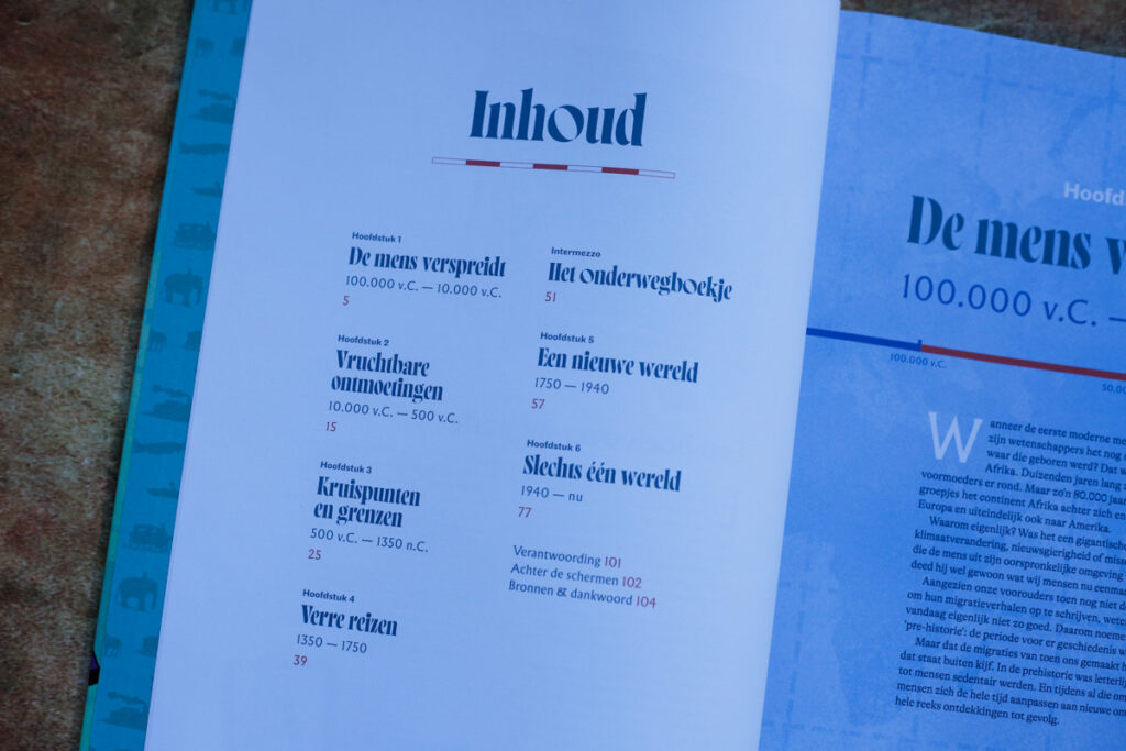 Vervolgens wordt aan de hand van een wereldkaart inzichtelijk gemaakt welke migraties besproken gaan worden in dit hoofdstuk. De ene keer zie je hier wat meer migraties dan de andere keer. Elke migratie wordt in een spread beschreven vanuit het perspectief van een ooggetuige, alsof het aan je wordt verteld en jij erbij staat of mag luisteren, en gevolgd door een stukje informatie over die periode en hoe we dat weten.