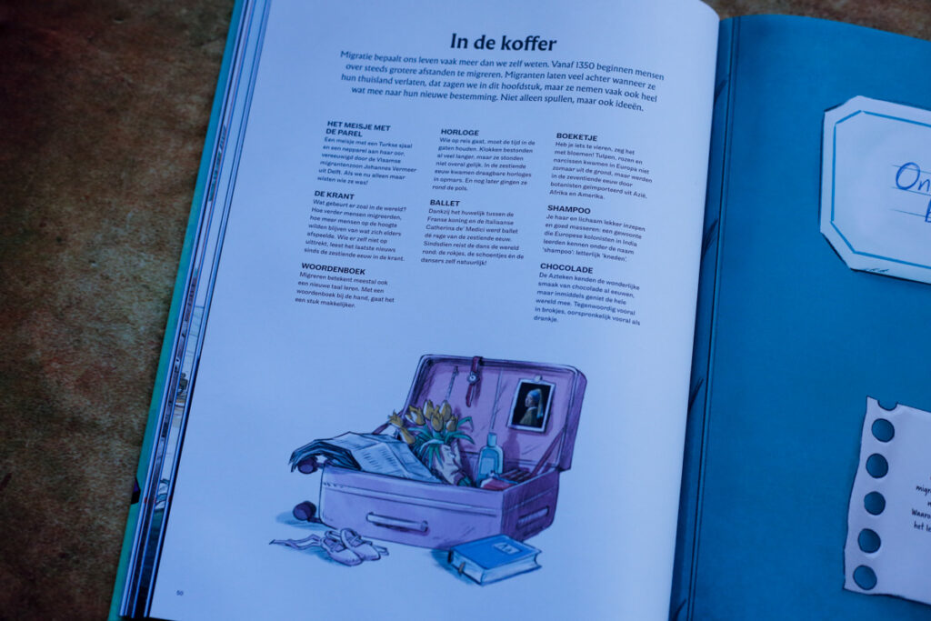 Aan het einde van elk hoofdstuk vind je dan een koffer. Want migreren betekent spullen meenemen die je dierbaar zijn of echt nodig zult hebben. En wat van deze spullen van toen gebruiken wij nog steeds als wij zelf op reis gaan? Denk aan een stukje zeep, medicijnen, kleding of zelfs je huisdier.
