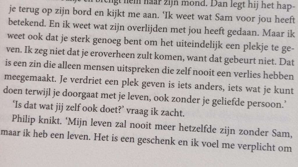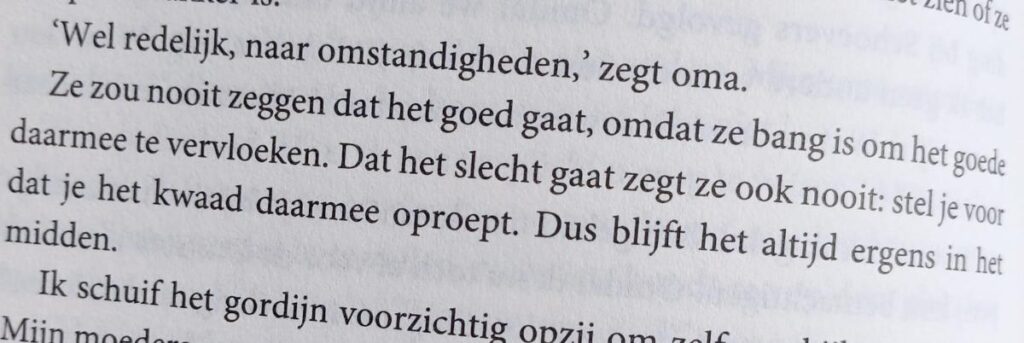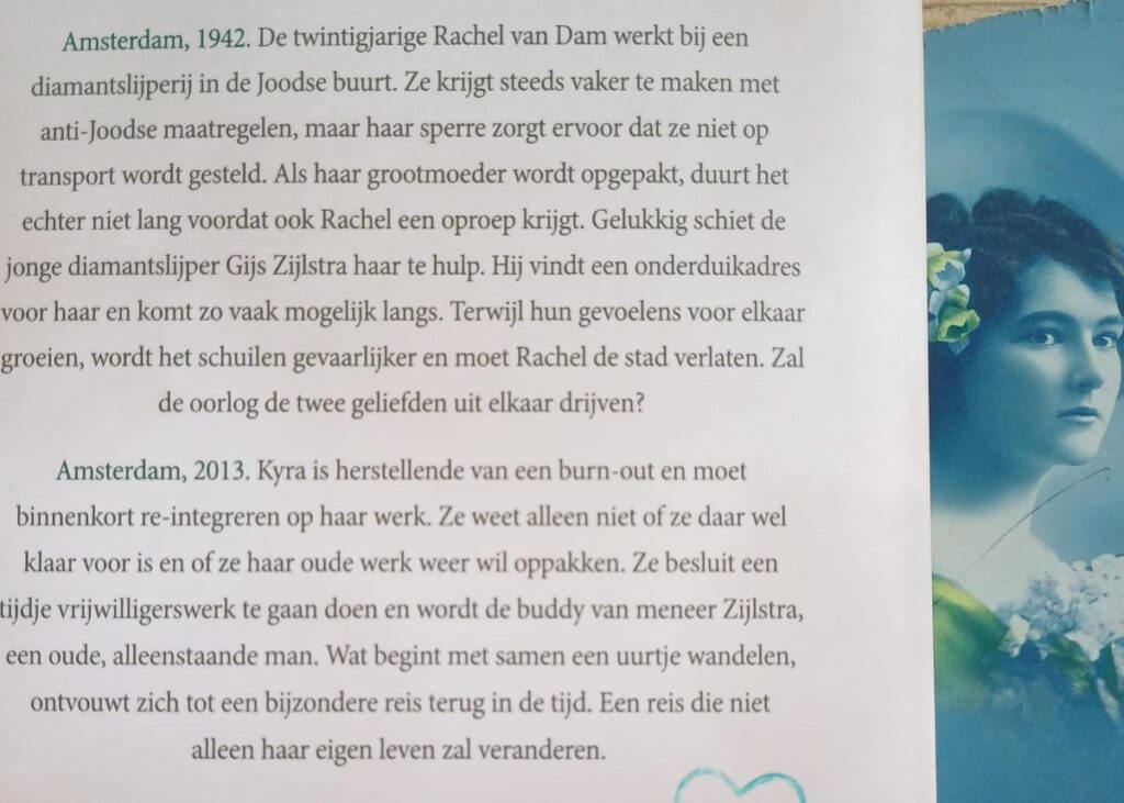 Over het algemeen vind ik bij boeken met twee verhaallijnen uit het verleden het meest interessant. Echter was ik deze keer ook erg gecharmeerd van het verhaal in het heden. Het is bijzonder om te lezen hoe de jonge Kyra vriendschap sluit met de wat nukkige meneer Zijlstra. Voor mij herkenbaar omdat ik eens hetzelfde meemaakte in een verzorgingshuis maar dan met een dame. Het is zo bijzonder wat de oudere generatie allemaal te vertellen heeft en je nog kan bijbrengen aan levenservaring.