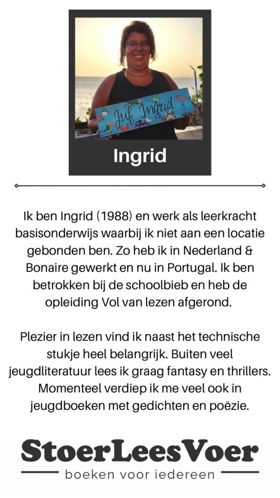 Ik ben Ingrid (1988) en werk als leerkracht basisonderwijs waarbij ik niet aan een locatie gebonden ben. Zo heb ik in Nederland & Bonaire gewerkt en nu in Portugal. Ik ben betrokken bij de schoolbieb en heb de opleiding Vol van lezen afgerond. Plezier in lezen vind ik naast het technische stukje heel belangrijk. Buiten veel jeugdliteratuur lees ik graag fantasy en thrillers. Momenteel verdiep ik me veel ook in jeugdboeken met gedichten en poëzie.