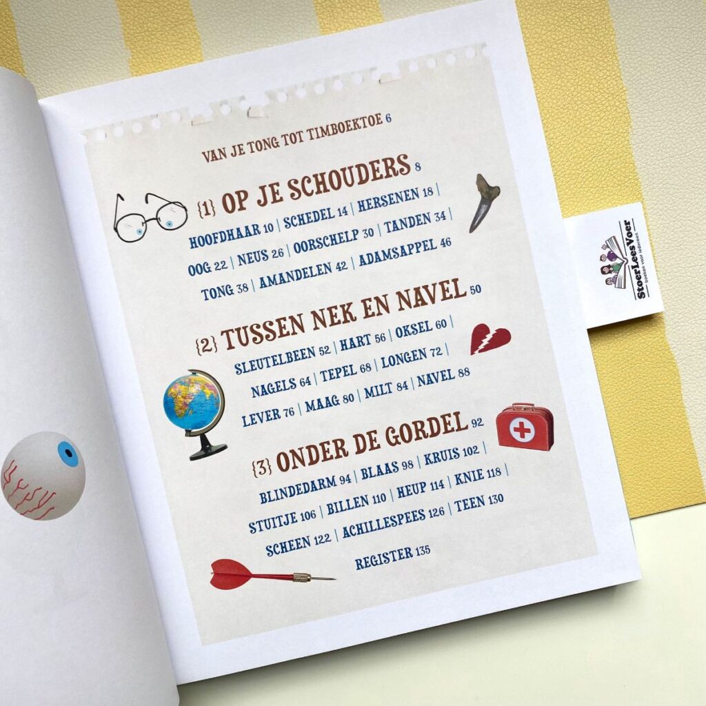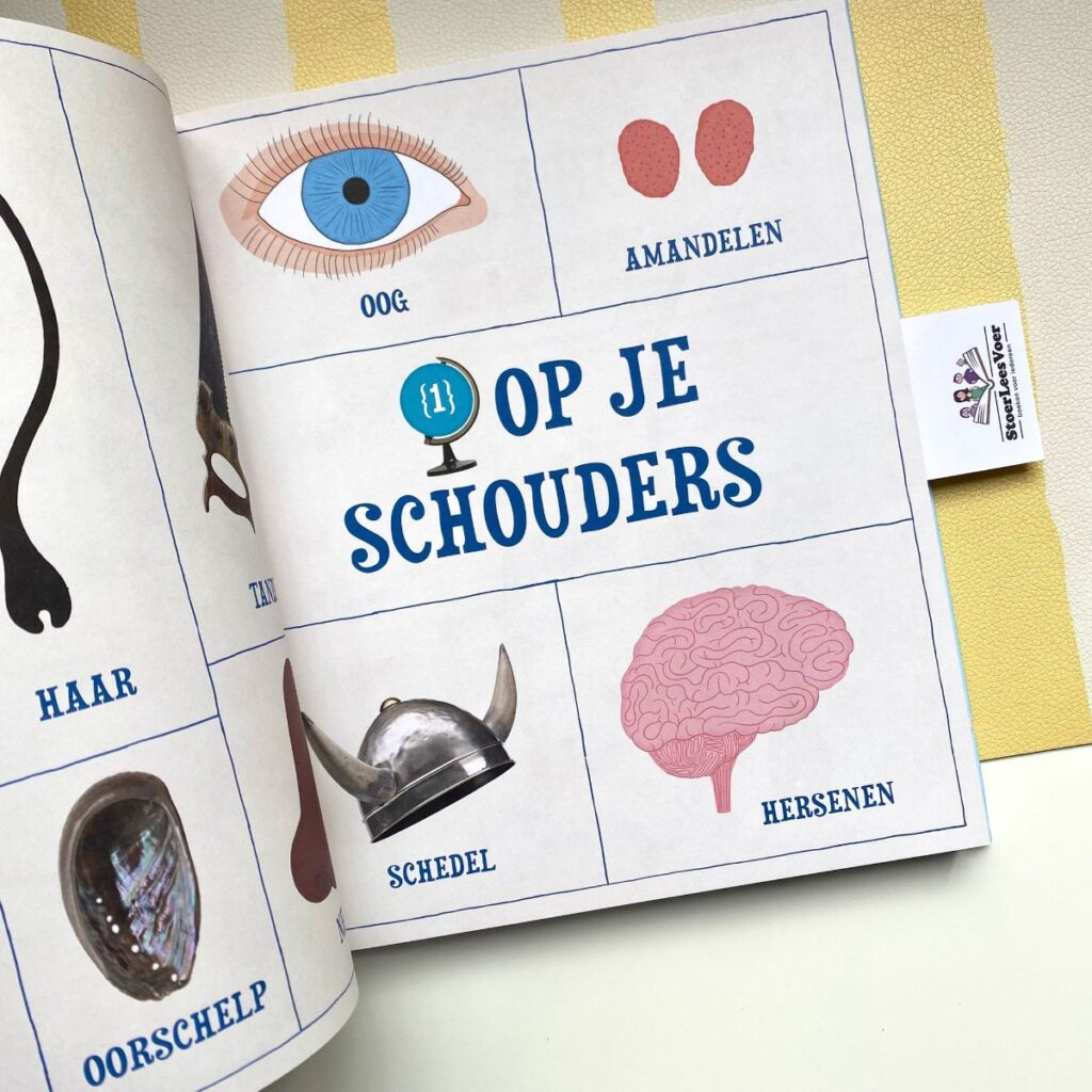 Zoals jullie zien heeft Van tong tot teen eigenlijk alles plus heel veel meer. Wij genieten hier thuis echt van dit boek. Mijn jongste dochter van 6 zoekt natuurlijk op het oog en dan lees ik of haar zus van 11 de tekst voor. De teksten bevatten uiteraard rijke woorden, maar het is echt heel goed passend voor de doelgroep geschreven. Met plezier, humor en toch informatief leren we de leukste feitjes. En door die combinatie van informatie en humor gaat leren vanzelf. De opbouw is modulair, je kan zelf bepalen in welke volgorde en op welke manier je dit boek leest. En als je gerichter wilt navigeren kan dat dus ook door de inhoudsopgave en het register.