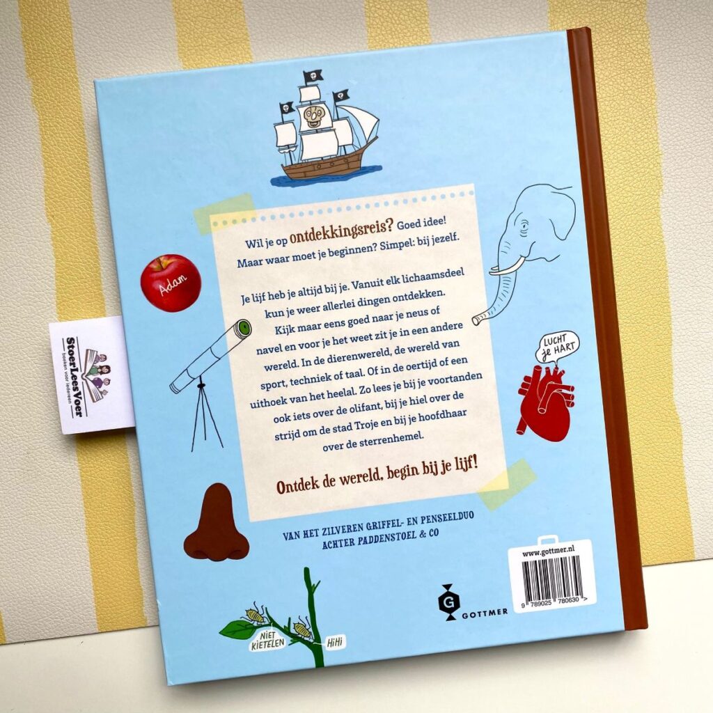 Wil je de wereld ontdekken? Goed idee! Maar waar moet je beginnen? Dat is simpel: bij jezelf. Bij je eigen lijf. Dichterbij kan niet. En je hoeft niet te zoeken, want je lichaam heb je altijd bij je. Je lijf is razend interessant. Elk lichaamsdeel heeft zijn eigen verhalen en die staan in dit boek. Je leest waar het lichaamsdeel zit. Hoe het eruitziet. Hoe het werkt. Dat soort dingen. Een boek over het menselijk lichaam dus? Ja en nee. Dit boek doet namelijk iets wat in andere informatieve boeken verboden is: afdwalen. Meestal maar één stap, maar dat is al genoeg om in een andere wereld te zitten. In de dierenwereld bijvoorbeeld. Of in de wereld van de sport, techniek of taal. Of in een andere tijd, want dit boek gaat ook over geschiedenis. En zelfs over het heelal. Maar het begint dus steeds bij jezelf.
