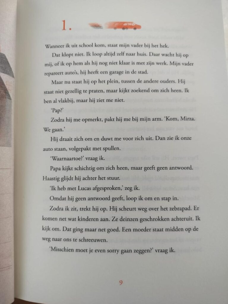 Dit aangrijpende gevoel blijft het hele boek hangen. Mirza wordt meegenomen naar een ander land en moet zich daar staande gaan houden. Hij spreekt de taal niet en heeft andere gebruiken dan zijn nieuwe klasgenoten. Zijn vader blijft ook lang onduidelijk en er speelt veel rondom het verleden van zijn vader. Dit maakt dat je echt meegezogen wordt in het boek. Het nodigt uit om door te blijven lezen. De hoofdstukken zijn kort en het boek is bijna niet weg te leggen. Waarom is Mirza meegenomen en hoe houdt het hij het vol.