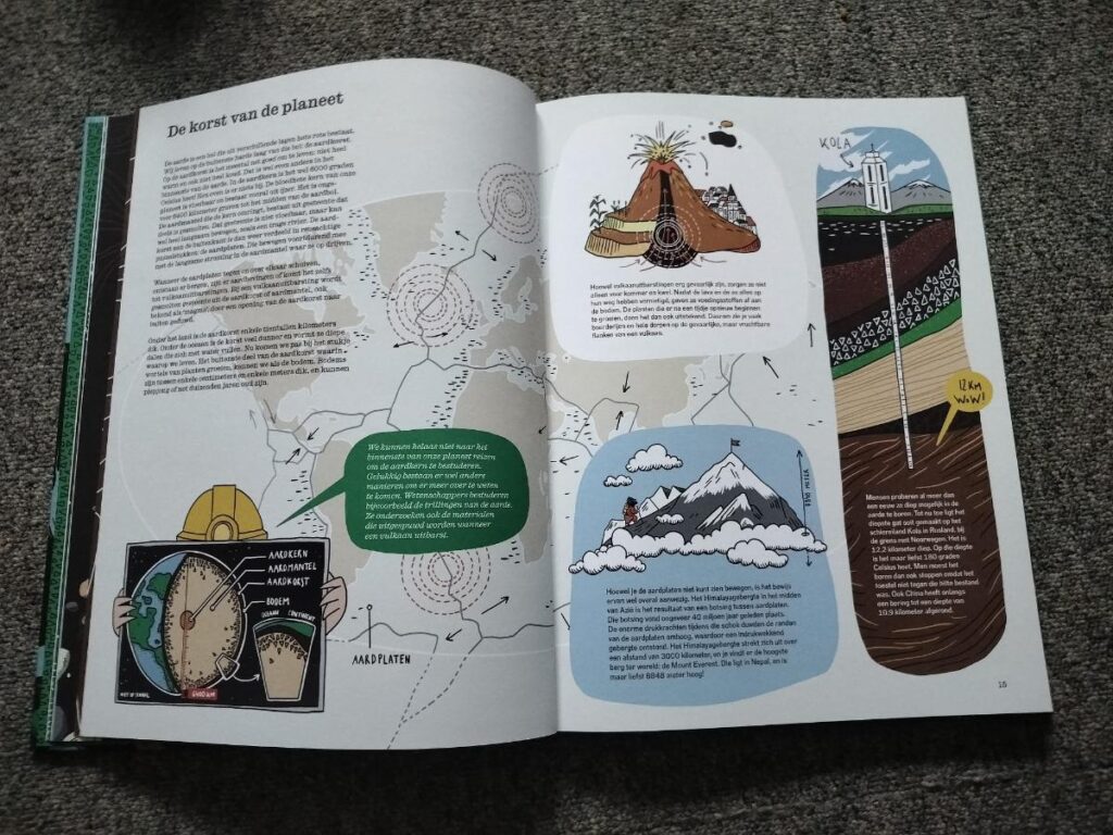 Wondergrond is een mooi verzorgd, dik informatief boek voor kinderen van 8-10 jaar. Ik hou van het stevige papier. De illustraties verdienen een aparte vermelding, want eigenlijk is het een prachtige symbiose tussen tekst en beeld. De informatie wisselt tussen langere stukken tekst en korte wetenswaardigheden. Ook wordt er geregeld een tip of doe-opdracht gegeven. Een fijne afwisseling. Sommige tips zijn wel voorspelbaar. Maar een aantal tips en ook websites rondom bijvoorbeeld je eigen bodem onderzoeken, waren voor mij nieuw en voegen extra interactie toe. Het boek roept zeker ook op tot zorgen voor de bodem en legt goed uit waarom.