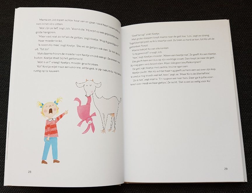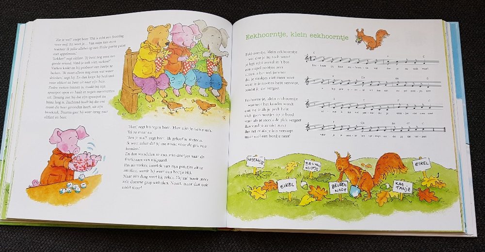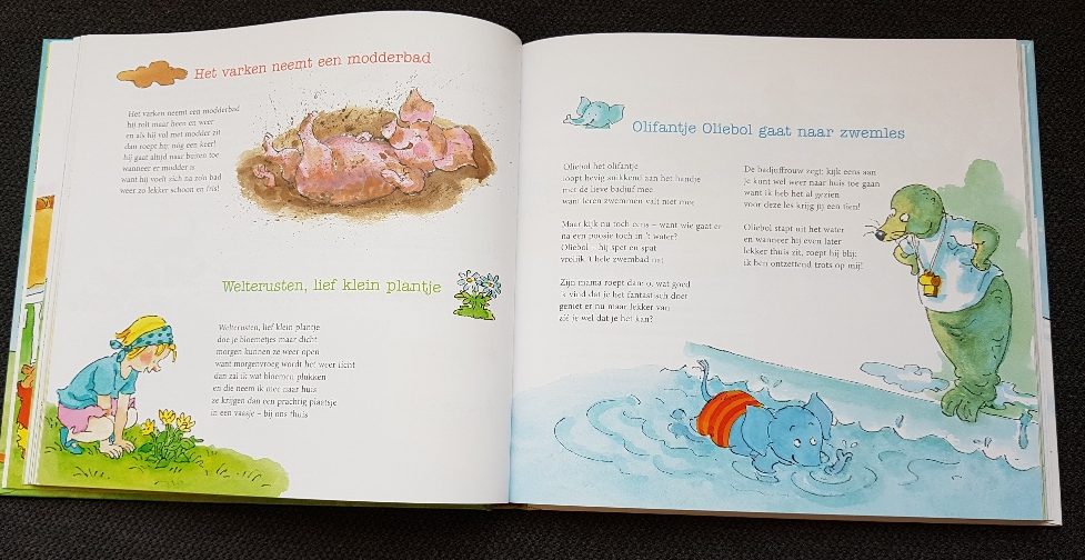 Er zijn grote verhalen van 3 pagina’s maar ook verhalen van 1 of 2 pagina’s. Er zijn rijmpjes en liedjes en heel veel leuke prenten van Dagmar Stam waar van alles op te zien is.