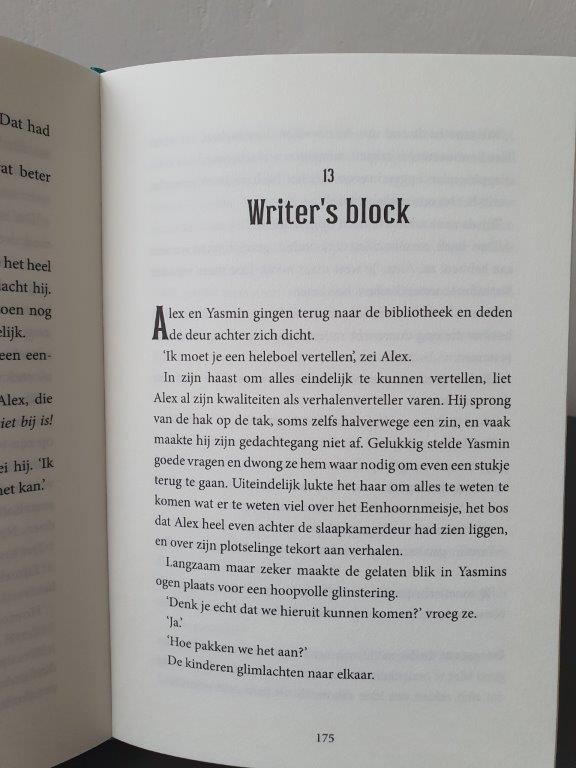 Wat heel fijn is, is dat in Alex M. en de boeken van de Nacht er ruimte is voor de letter. Ik vermoed dat deze jeugdroman niet voldoet aan de criteria voor een ‘Groot-letter boek’, maar het zijn grotere letters dan ik gewend ben. Er zijn geen illustraties in het boek te vinden, maar wel grappige aantekeningen van het Eenhoornmeisje waardoor je een soort Droste-effect in het boek ontwaart. Een verhaal waarin verhalen staan en waar dan ook weer verhalen staan. Gek genoeg vond ik dat prima te volgen allemaal.