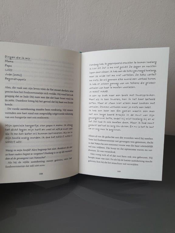 Op een dag komt hij de aantekeningen tegen van een kind dat eerder heeft vastgezeten. Alex noemt haar Eenhoornmeisje. Het lukt hem niet om een verhaal te verzinnen. Dus lees Alex verhalen voor uit zijn één van zijn nachtboeken. De lezer krijgt die verhalen ook mee en het zijn zonder uitzondering griezelverhalen. Als Alex klaar is met lezen, volgt er steevast een gesprek met de heks Natascha. Zij heeft weliswaar een paar rake opmerkingen en enkele waarheden, maar ook één grote leugen met vergaande gevolgen.