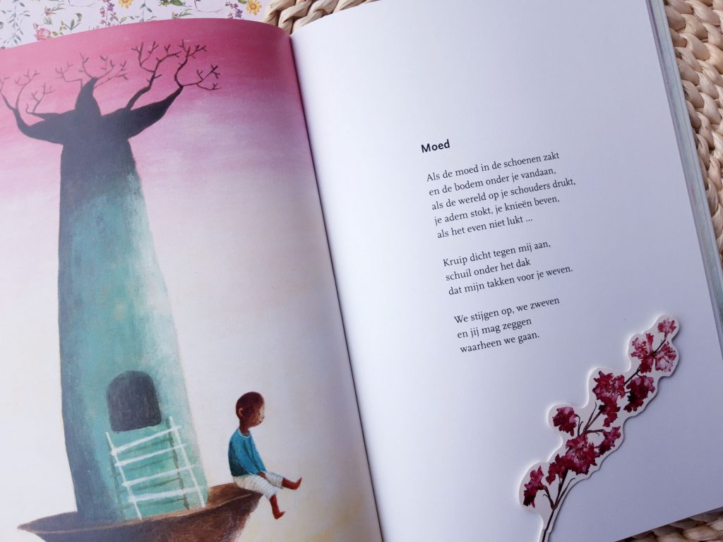 Moed is een prachtig gedicht, behorend bij de illustratie op de voorkant van het boek. Een boom in de lucht, die opstijgt als het moeilijk wordt. Waar je kunt schuilen als de wereld op je schouders drukt. Dan heb je iemand naast je nodig die je alle wensen van de wereld gunt. En jij mag zeggen waarheen we gaan.