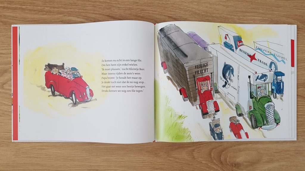 Tijdens het voorlezen van ‘Alle wielen in de file’ klinken de vrolijke rijmzinnen haast sarcastisch doordat het slechte humeur van papa Beer duidelijk aanwezig is. Dat begint al in de rij bij het tankstation waar hij niet meer blij kijkt en het al over ‘stomme file’ heeft. Vervolgens krijgt hij een bekeuring als hij door rood licht rijdt en ligt er een vrachtwagen met wel duizend kippen op zijn kant. En dat Kleintje Beer om de haverklap vraagt of ze er al zijn, maakt papa Beer natuurlijk ook niet vrolijk.
