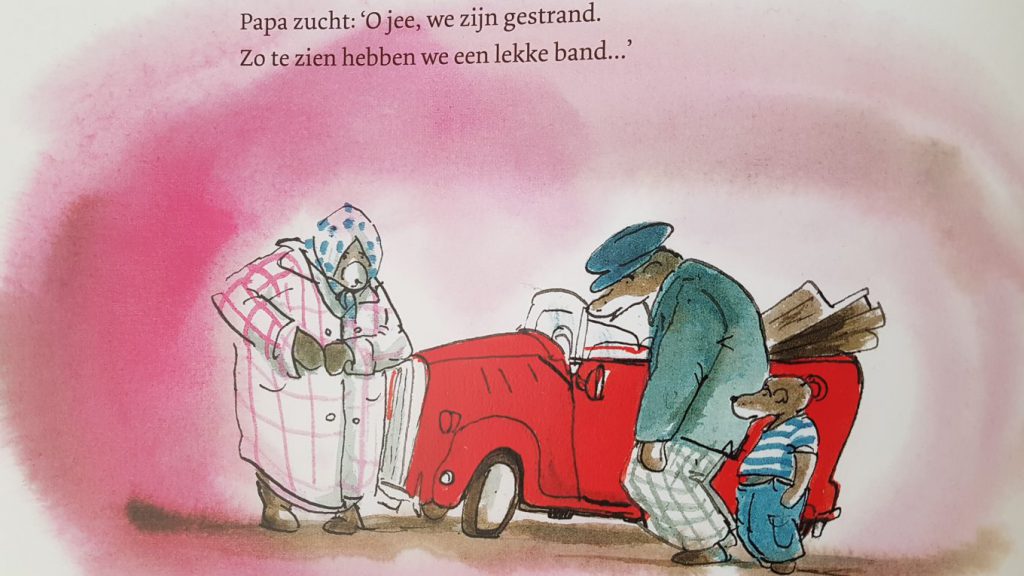 Een paar dagen voordat mijn zoontje en ik de eerste keer ‘Alle wielen in de file’ lazen, hadden we toevallig echt een lekke band gehad met de auto. Normaal ben ik degene die een verhaaltje voorleest of iets verzint bij een plaatje in een boek, maar dit keer begon hij zelf enthousiast te vertellen hoe goed hij mama geholpen had met het wiel verwisselen. Ik liet hem toen namelijk het laatste stukje van de schroeven toen losdraaien zodat hij dacht dat hij het zelf had gedaan, prachtig hoe trots hij toen keek! Gewoon op de parkeerplaats voor de deur hoor, niet op de snelweg. En gelukkig ook niet met een brommende papa Beer in de auto!