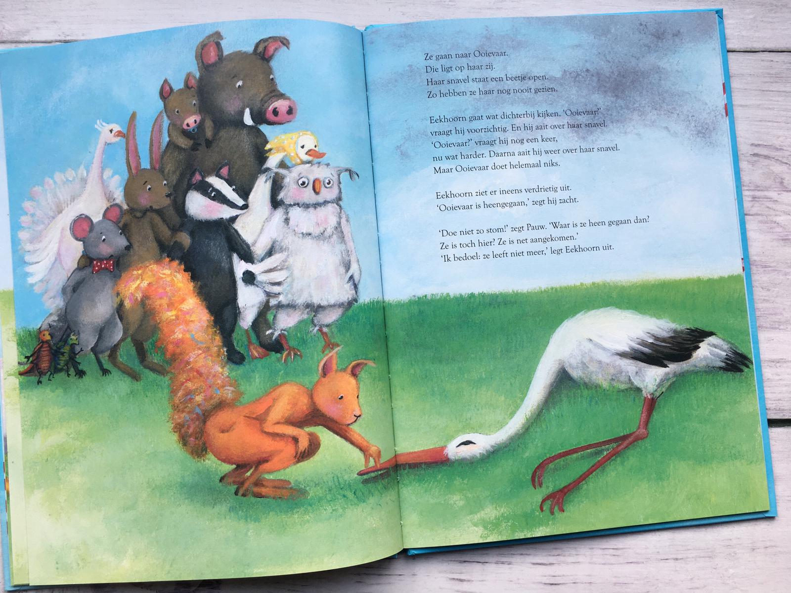 Maar vandaag gaat het anders. Ooievaar vliegt anders. Langzamer. En als ze er eenmaal is, valt Ooievaar steeds stil. Ze is moe, moet even rusten. Even later komen ze erachter dat Ooievaar helemaal niet meer beweegt. Ze is dood. De dieren gaan samen afscheid van haar nemen.