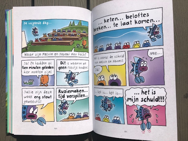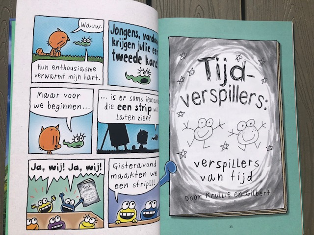 Maar, de kleine kikkers zijn niet alleen aan het keten. Ze leren ook hoe je een strip maakt. En de lezer komt er ook achter. Bijvoorbeeld hoe je heel simpel je naam in perspectief maakt. Met een paar handelingen ziet dat er snel vet cool uit! Wat ik altijd hilarisch vindt is dat de kikkers meteen doen wat in hun hoofd opkomt. Hé we gaan een strip maken over Tijdverspillers! En wie zijn dat dan? Nou, dat zijn verspillers van tijd. Dat is toch helder? Alles wordt letterlijk genomen. Eigenlijk zoals kinderen dat ook doen. Heerlijk. En zo, zijn kikkers dus aan het keten.