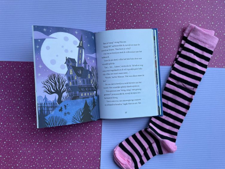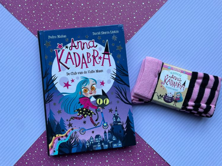 En op de tekeningen van Anna Kadabra de club van de volle maan, ben ik gewoon een beetje verliefd! Wauw, zo kleurrijk en qua stijl ook echt anders dan je in andere boeken ziet. Het boek is volledig uitgevoerd in full colour, waardoor je echt het idee hebt dat je een cadeautje in handen hebt. En dan krijg je er ook nog eens een echt cadeautje bij: leuke Anna Kadabra kniekousen! Voor mij kan deze nieuwe serie dus niet meer stuk, en ik kijk nu al uit naar het volgende deel!