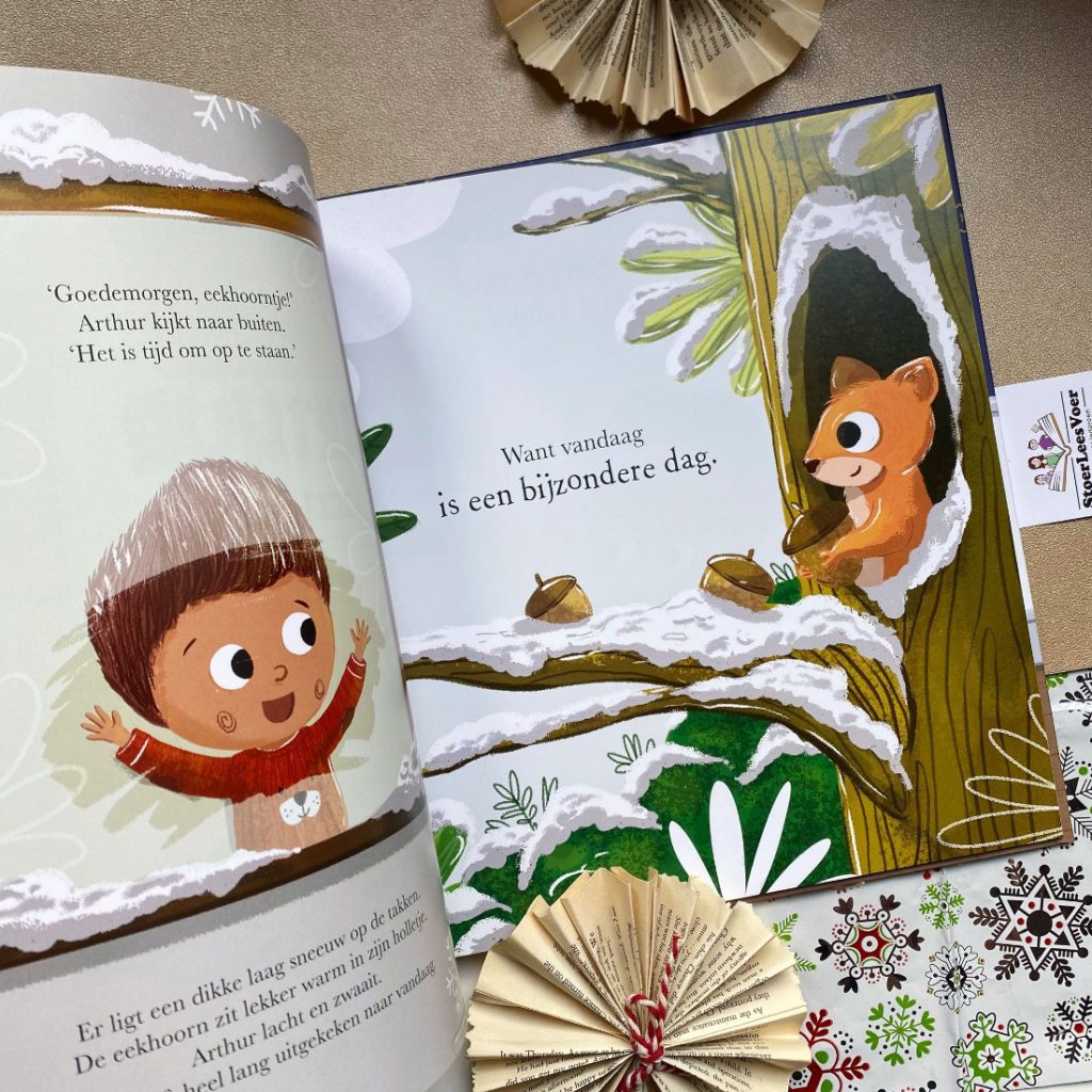 Omdat we al twee andere boeken eerder hebben gelezen valt ons de herhaling op in Arthur viert kerst. Het hoofdkarakter wordt wakker en start fris aan een dag. Ze kijken door een raam en zien het landschap buiten. Dat is nu dus winters, want in de herhaling zit afwisseling. Leuk detail vind ik dat het raam beslagen is van de kou. Vanuit een boom kijkt een lief eekhoorntje naar Arthur. Dit kleine vriendje reist mee door het verhaal, ga het maar zoeken op de bladzijden!