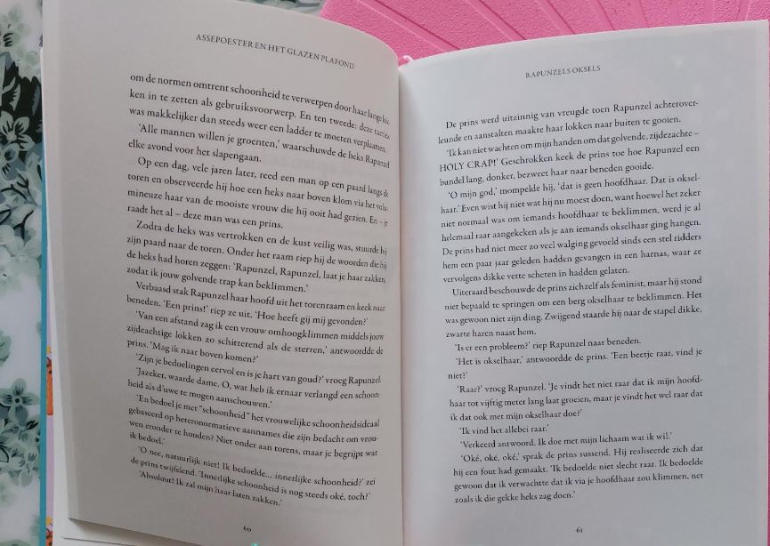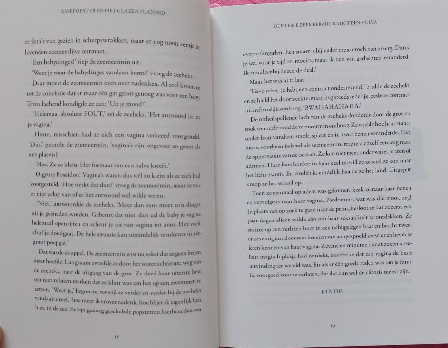 Ik heb echt in een deuk gelegen om sommige verhalen uit Assepoester en het glazen plafond. Zo krijgt de kleine zeemeermin van de heks uitleg over haar vulva. Alles van plassen tot menstruatie en vrijen waarbij een man voor pak ‘m beet ongeveer 10 minuten herhaaldelijk zijn penis in je vulva stopt. Over de pil, kinderen krijgen en een geheim plekje genaamd de clitoris. Ik kan je 1 ding vertellen, de kleine zeemeermin heeft zich eerst even verstopt achter een rots om haar vulva eens grondig te bestuderen.. grinnik.