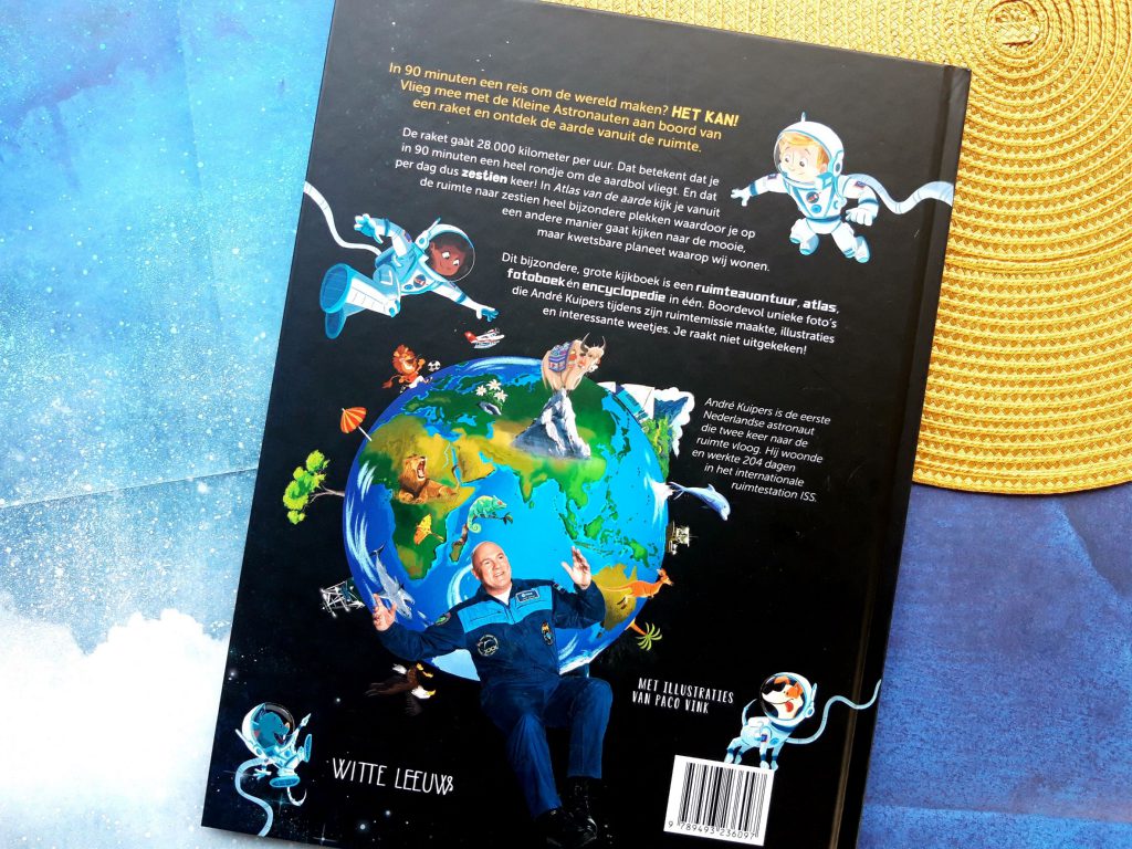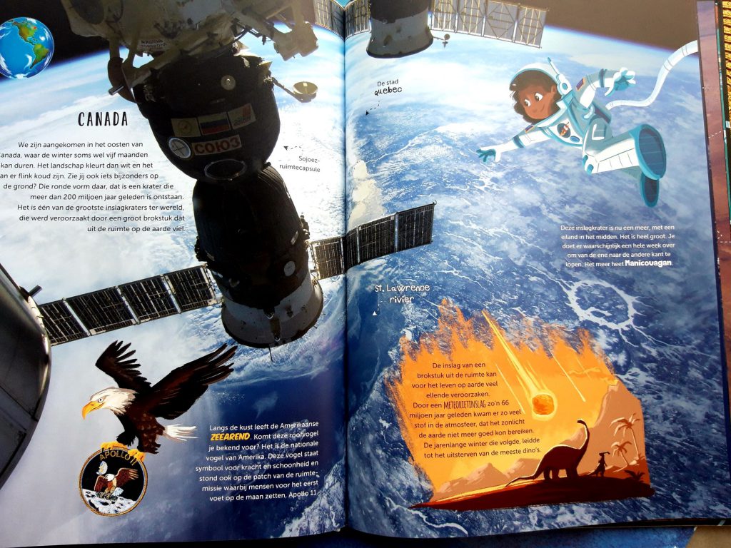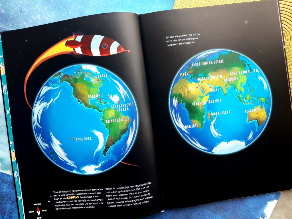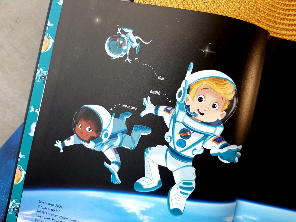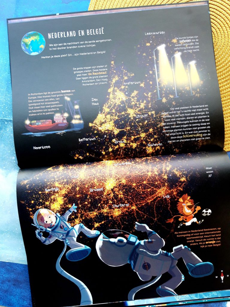 We gaan op ruimtereis met vier kleine astronauten: André, Valentina, muis en Laika. En ze zijn niet voor niks zo genoemd. Valentina is bijvoorbeeld vernoemd naar Valentina Tereshkova, de eerste vrouw in de ruimte. En Laika de hond was natuurlijk het eerste levende wezen in de ruimte. Zij laten met elkaar een aantal hele bijzondere plekken zien. Bijvoorbeeld de turquoise zee bij de Bahama’s. Maar ook het Amazonewoud en de Alpen. We zien landen zoals Australië en Namibië vanuit de lucht. En zelfs een prachtige foto van Nederland en België in de nacht. Met ontelbaar veel lichtjes.