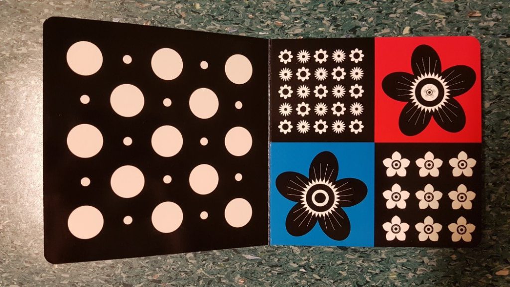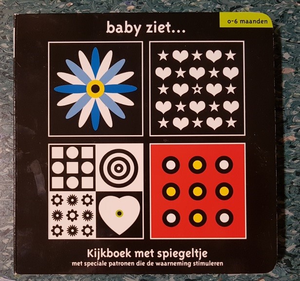Op de leeftijd van twee maanden heeft je baby een sterke voorkeur voor zwart-witpatronen. Vanaf drie maanden wordt de aandacht getrokken door patronen in combinatie met felle kleuren. Het boek Baby ziet is dan ook heel geschikt als kijkboek voor baby’s van enkele maanden oud. Door naar de patronen en kleuren te kijken worden de hersenen en de visuele ontwikkeling gestimuleerd.