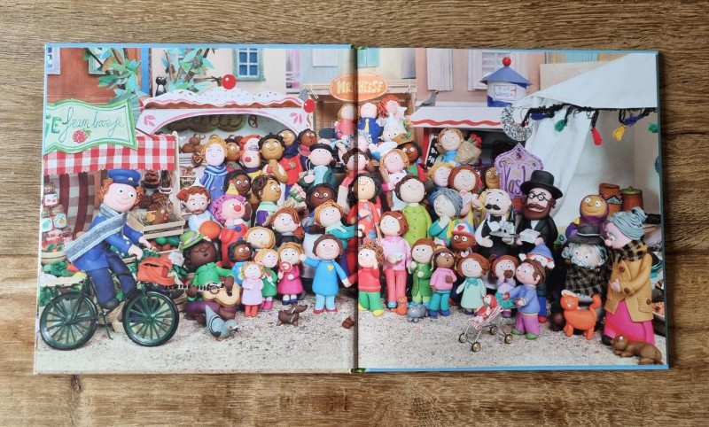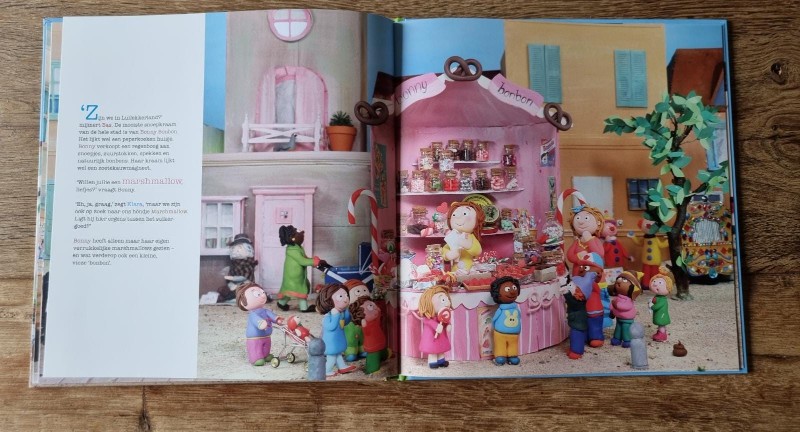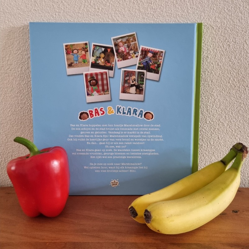 Wauw, daar lag een uniek boek op mijn deurmat! Bas & Klara op de markt straalt je tegemoet als je de cover bekijkt. Want dit is niet zomaar een boek met illustraties, nee dit boek is geïllustreerd met FIMO klei. Natuurlijk vertel ik je daar straks meer over, net als over het verhaal. Ga je mee op zoek naar Marshmallow? Hij heeft drolletjes achtergelaten en leidt ons over de hele markt door zijn wegloopactie.