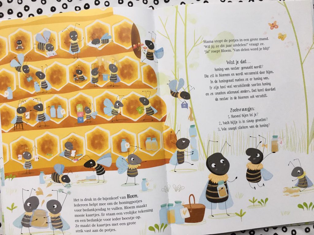 Het is druk in de bijenkorf van Bloem de bij. Want het is vandaag bedankjesdag! Bloem maakt mooie kaartjes, want hij gaat bij elk beestje een bedankje brengen. Hij gaat bij als zijn vriendjes op bezoek om de potjes honing met de kaartjes uit te delen.