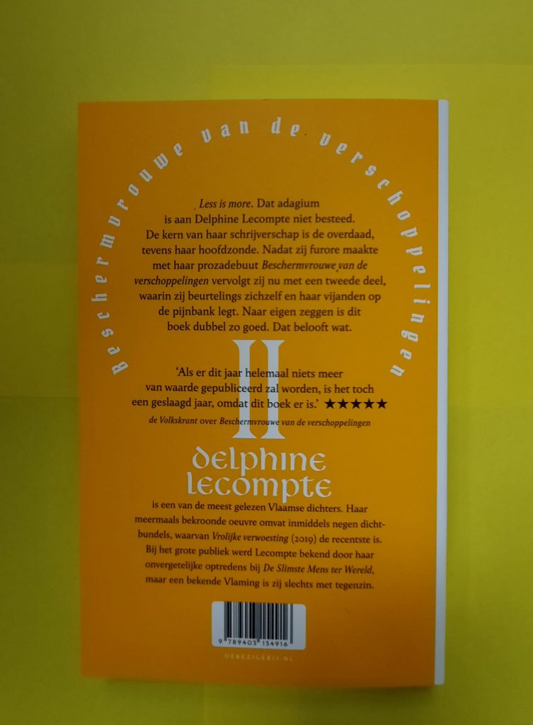 Beschermvrouwe van de verschoppelingen 2 is het nieuwe boek van de Vlaamse schrijfster Delphine Lecompte. Binnen 1 jaar tijd heeft zij deel 1 en deel 2 uitgebracht, wat al bijzonder is. En bijzonder, dat is de schrijfster en het boek zelf ook. Ik ken Lecompte alleen vanuit het Vlaamse televisie programma De Slimste Mens. Daarin was zij een opvallende verschijning. Wat verlegen en schuw, met verrassende en bizarre uitspraken en veel humor. Ik was erg benieuwd naar dit boek, en of mijn beeld vanuit dat televisieprogramma ook in het boek terug te lezen was. En ik werd op mijn wenken bediend.