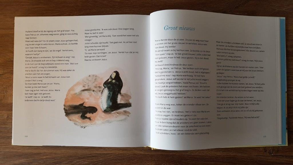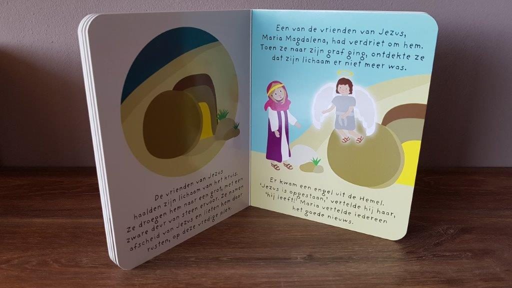 In het boekje met verhaal van Jezus komt het Paas-verhaal voorbij. Het kan misschien lastig zijn om dit voor te lezen aan kleine kinderen. Tenminste, ik vond het zelf moeilijk om het woord “dood” voor het eerst hardop te zeggen tegen mijn zoontje. En het voelde een beetje raar om hem voor te lezen dat Maria ontdekte dat het lichaam van Jezus niet meer in het graf was en dat hij was opgestaan. Maar goed, de tijd zal leren wat mijn zoontje daarvan zal vinden.