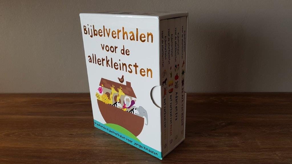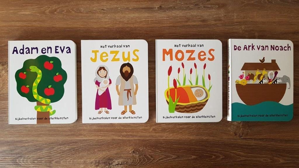 Deze kartonboeken vertellen alle vier een verhaal uit de Bijbel. Adam en Eva, De Ark van Noach, Mozes en het verhaal van Jezus. Deze serie is een perfecte kennismaking met de Bijbel. Voor kinderen vanaf 2 jaar.