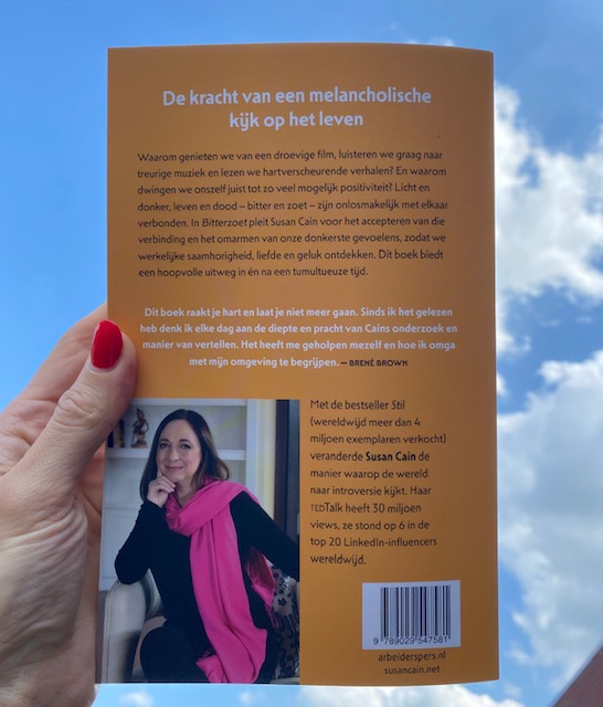 Wow, wat is Bitterzoet goed geschreven. Het gaat zo vloeiend over van de ene naar andere alinea en is steeds weer interessant en inspirerend. Er staan wel veel lange zinnen in, maar ik vind het niet storend. Zoals deze mooie en veelzeggende zin van Cain over haar overleden vader: ‘De avond dat mijn vader stierf luisterde ik naar zijn muziek, niet omdat ik hem daar zou vinden -ik vond hem daar niet- maar omdat liefde voor een ouder en liefde voor gezang of sport, natuur of literatuur, wiskunde of natuurkunde, allemaal slechts verschillende manifestaties van de perfecte, mooie wereld zijn, van de mensen naar wie we verlangen, de plek waar willen zijn.’