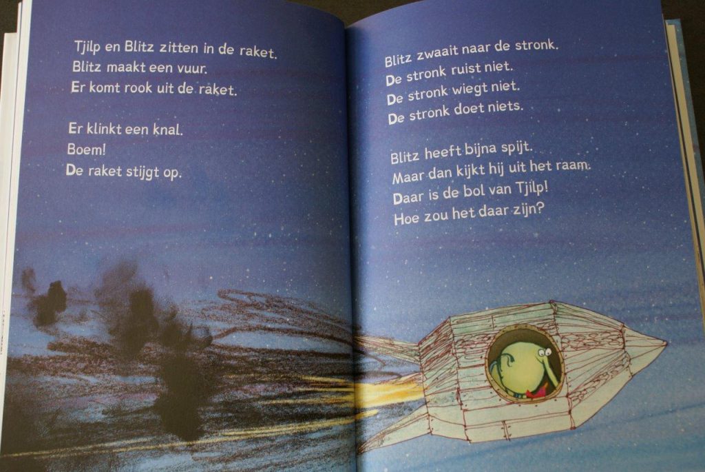 Blitz! is een vreemd wezentje. Hij woont op zijn eigen bol in de ruimte. Hij woont daar alleen, hij eet iedere dag van zijn boom en is tevreden. Tot … op een dag er wit spul op zijn neus belandt. Het is geen sneeuw, maar wat is het dan wel? Dat is het moment waarop Blitz! het vogeltje Tjilp ontmoet. Het moment waarop Blitz! ontdekt dat het fijn is om een vriend te hebben. Zou er iemand op aarde zijn die op hem lijkt? Hij gaat het uitzoeken. En dat levert een leuk, spannend en wijs verhaal op.