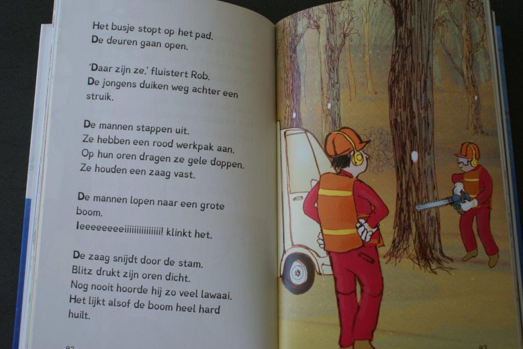 Wel vond mijn dochter dan weer dat de kaft op het boek niet klopte. Blitz! hangt ondersteboven. Dat klopt niet. Blitz! eet elke dag van een boom met ook voor ons bekende lekkernijen, zoals donuts en lolly’s. Allemaal in één boom! Op Bol Nul heetten ze anders, hap en lik. Leuk bedacht. Herkenbaar, maar toch anders. Zoals ik al zei, allesbehalve saai. Ook Elias (11) herkende het boek nog van groep 3. “O ja!, die is Leuk!”.