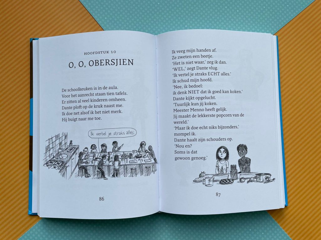 Het succes van deze serie zit hem niet alleen in de humor, maar zeker ook in de eenvoud. De boeken van Bob Popcorn zijn heel eenvoudig te lezen. Deze serie krijgt ook niet-lezers aan het lezen! Toen mijn jongste dochter haar boekenspreekbeurt hierover hield, waren er meteen heel veel kinderen ontzettend enthousiast en sindsdien zijn de boeken elke keer uitgeleend in de schoolbieb… En verder zijn de tekeningen natuurlijk ook geweldig! Zo grappig en echt ondersteunend voor het verhaal, en ook lekker veel. Ik vond alle verhalen van Bob Popcorn leuk, maar deze was ook weer top! Een beetje spannend, met lekker veel vaart én op het eind als ’toetje’ nog de recepten van Bob zelf. Zo kun je thuis nog even nagenieten van Bob Popcorn Meesterkok!