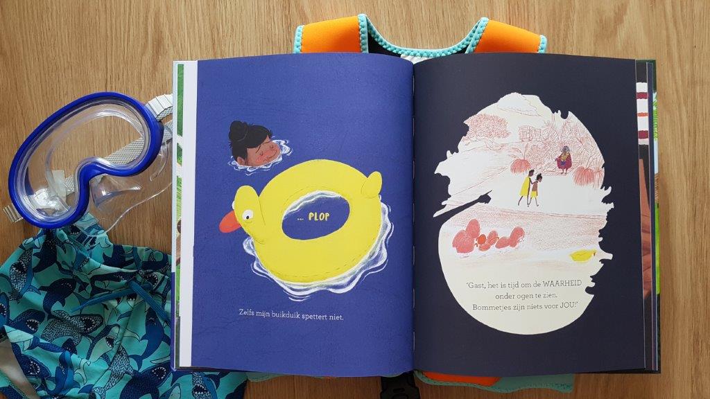 Maar zodra iemand roept: “Dit is niets voor jou!” zinkt de moed hem in de schoenen. Gelukkig weet Nan hem wijs te maken dat haar zonnetje naar zijn hart moet luisteren, naar zijn hoofd, naar het bommetje binnen in hem. En ineens beseft hij het, je moet in jezelf geloven! Prachtig om te zien hoe hij vervolgens vol zelfvertrouwen op de hoge plank gaat staan en zijn liedje (als startritueel) niet meer fluistert, maar uitschreeuwt. En eindigt in het perfecte bommetje, ter grootte van wel twee pagina’s! Het jongetje is DE BOM!