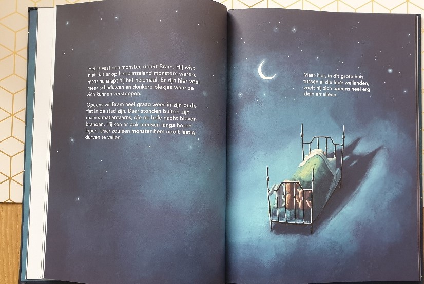 Het is soms namelijk best een beetje spannend als je verhuist naar het platteland. Een nieuwe omgeving, andere geluiden en zelfs de hemel ziet er anders uit in het donker. Bram is heel blij met zijn nieuwe kamer. Hij is zo groot en zo hoog met twee ramen erin. Hij speelt overdag zoet met zijn treinbaan en dan is het tijd om naar bed te gaan.