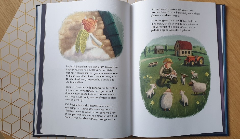 In dit prachtige voorleesboek komt ook een engeltje voor. Ze heet Lot en hoort alles als er om hulp wordt gevraagd. Zo hoort ze dus ook Bram die hulp nodig heeft bij zijn nare dromen. Lot hopt van wolk naar wolk. Ze weet natuurlijk dat monsters niet bestaan en ze weet ook precies wat ze moet doen om Bram te helpen. Op haar beurt heeft zij echter ook hulp nodig, van de boer die iets verderop woont.