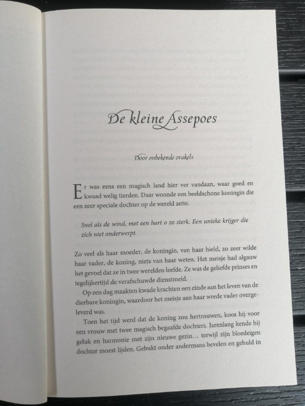 Het boek begint met het verhaal van Assepoester maar valt mij meteen iets op. De vader van Assepoester leeft nog wanneer de prins op zoek is naar een vrouw en Assepoester naar het bal wil. De koning is één met zijn vrouw en stiefdochters en heeft totaal geen liefde of aandacht voor zijn eigen dochter. Assepoester voelt zich totaal niet geliefd door haar vader. Dit voelde ze wel door haar moeder maar zij is helaas overleden, waarna haar vader is hertrouwd.
