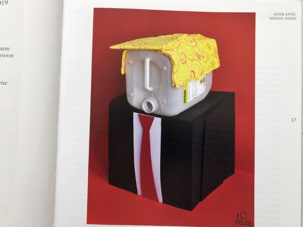 In de bundel Cartoons 2020 passeren de winnaars en de rest van de genomineerden de revue. Cartoons 2020 is vorm gegeven in een compact boek dat aan alle nominaties dezelfde presentatieruimte geeft. De genomineerden komen uit bijna 100 verschillende landen. Van Afghanistan tot Zwitserland. In totaal werden er 3800 cartoons ingestuurd. De winnaar van de Gouden Hoed is een Nederlander, Doede Okkema. Dat wakkert de nationale trots aan! De prijs van het publiek is een cartooneske verbeelding van Trump door middel van verschillende voorwerpen waaronder een jerrycan waar eerst vergif in heeft gezeten. Ik begrijp deze keuze van het publiek. Het beeld is namelijk ernstig, komisch en creatief en spitsvondig tegelijk.