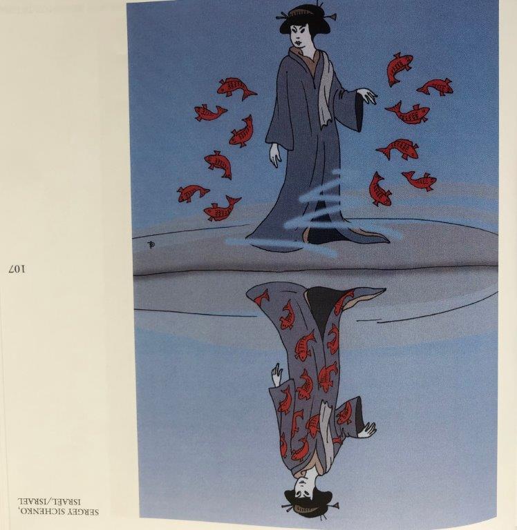 Zoals de cartoon van Hans Dierick waar een geel hesje is verwerkt in de Belgische Vlag, of het beeld van Sergey Sichenko (Israël), een vrouw in kimono met vissen, in haar weerspiegeling zitten de vissen in het water.