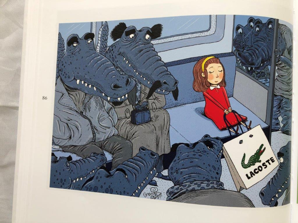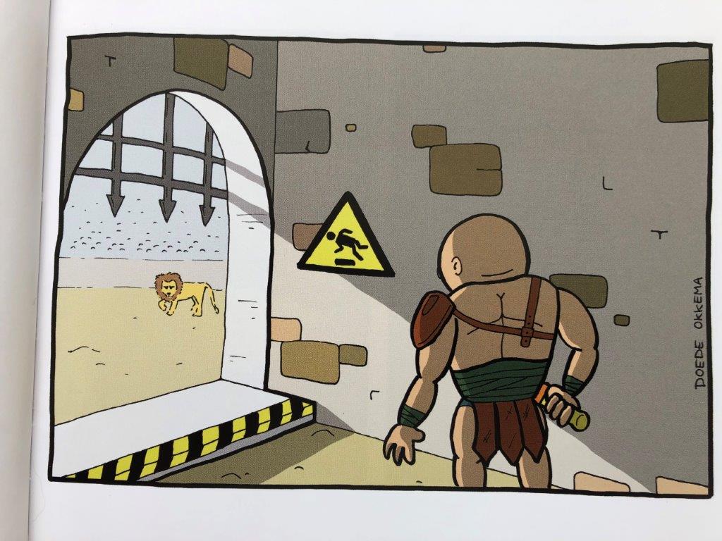 Bijvoorbeeld een beeld van een non-smoking en een smoking area waarbij een paar nonnen in de non-smoking area staan te roken. Of trump die het ‘V’ teken maakt. In de schaduw geeft hij zichzelf konijnenoortjes. Of dezelfde Trump die een muur aan het bouwen is en daar ineens een Mexicaan boven tegenkomt. Die komt mij bekend voor. Weet je nog de muur van Trompenburg? Tot slot het meisje met een Lacoste tas in een metro vol krokodillen.