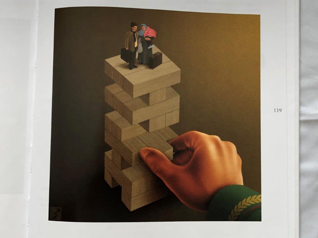 De bundel Cartoons 2020 presenteert de 100 nominaties op een gestructureerde, bijna thematisch, manier. Dat is dan ook prettig om naar te kijken. De thema’s zijn breed. Over onder andere macht (van het volk of van een leider), klimaat, religie, vluchtelingen. Komisch of ernstig en recht voor zijn raap en hier en daar bijna kunst te noemen. Ook Trump blijft een interessant doelwit.
