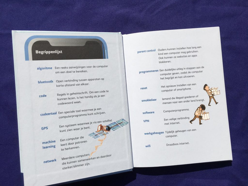 Deze boeken bevatten een verhaal, maar daarnaast ook allerlei leerzame informatie. Zo staat er voorin een begrippenlijst met alle moeilijke woorden. Op die manier kun je handig de technische termen opzoeken. En in het boek staan er kaders (in ‘Code WiFi’ heel leuk vormgegeven door deze in een mobieltje te plaatsen), met daarin meer uitleg. Wat is bijvoorbeeld een VPN verbinding en hoe komt dit tot stand?