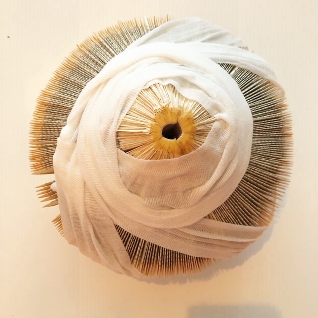 - Uitstulpende midden; hierbij heb ik telkens 2 bladzijdes in een evenwichtige driehoek gevouwen en dan een pagina dubbel in de lengte. Door dit af te wisselen kreeg ik deze vorm